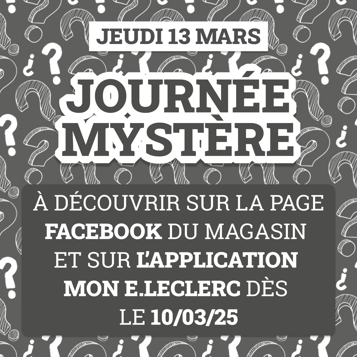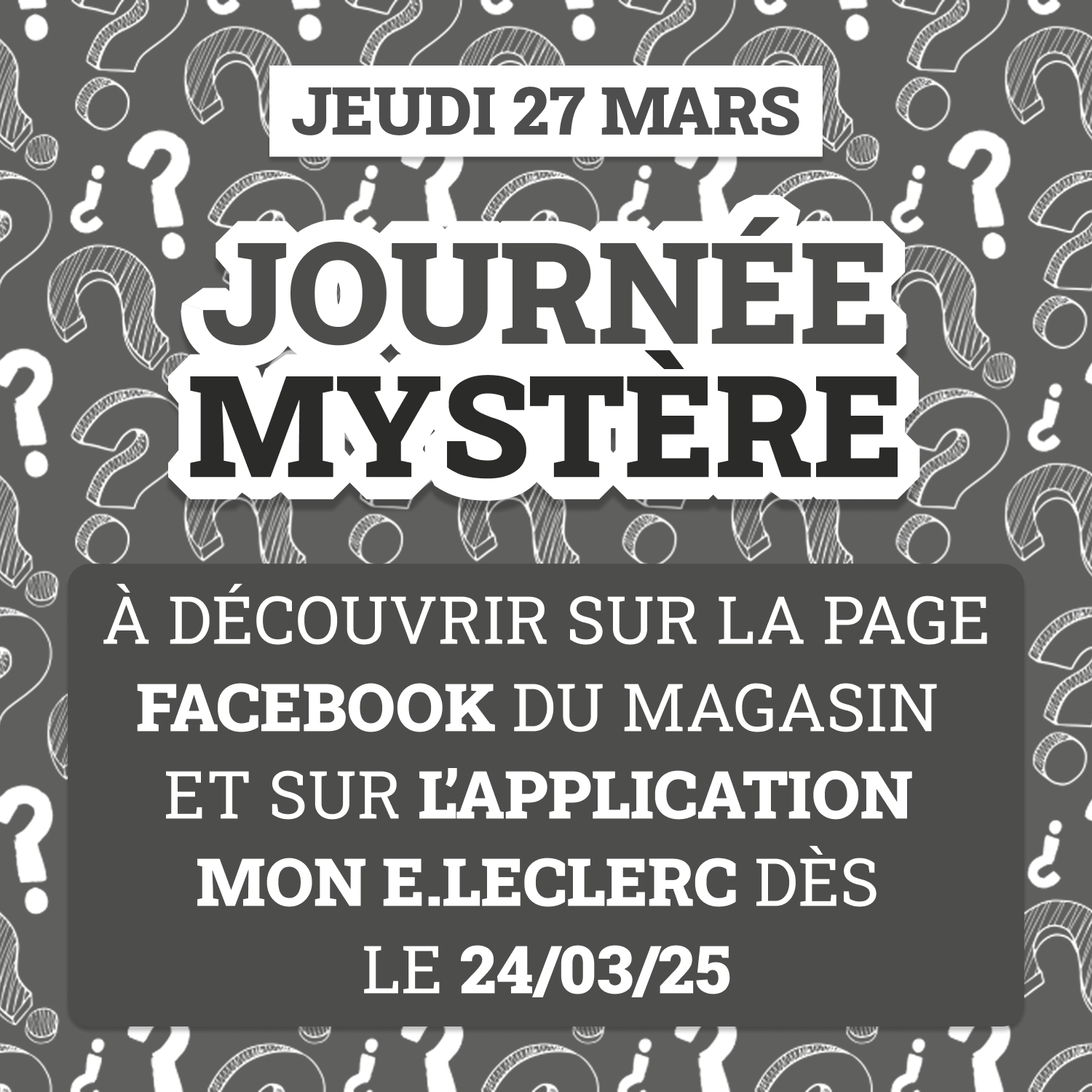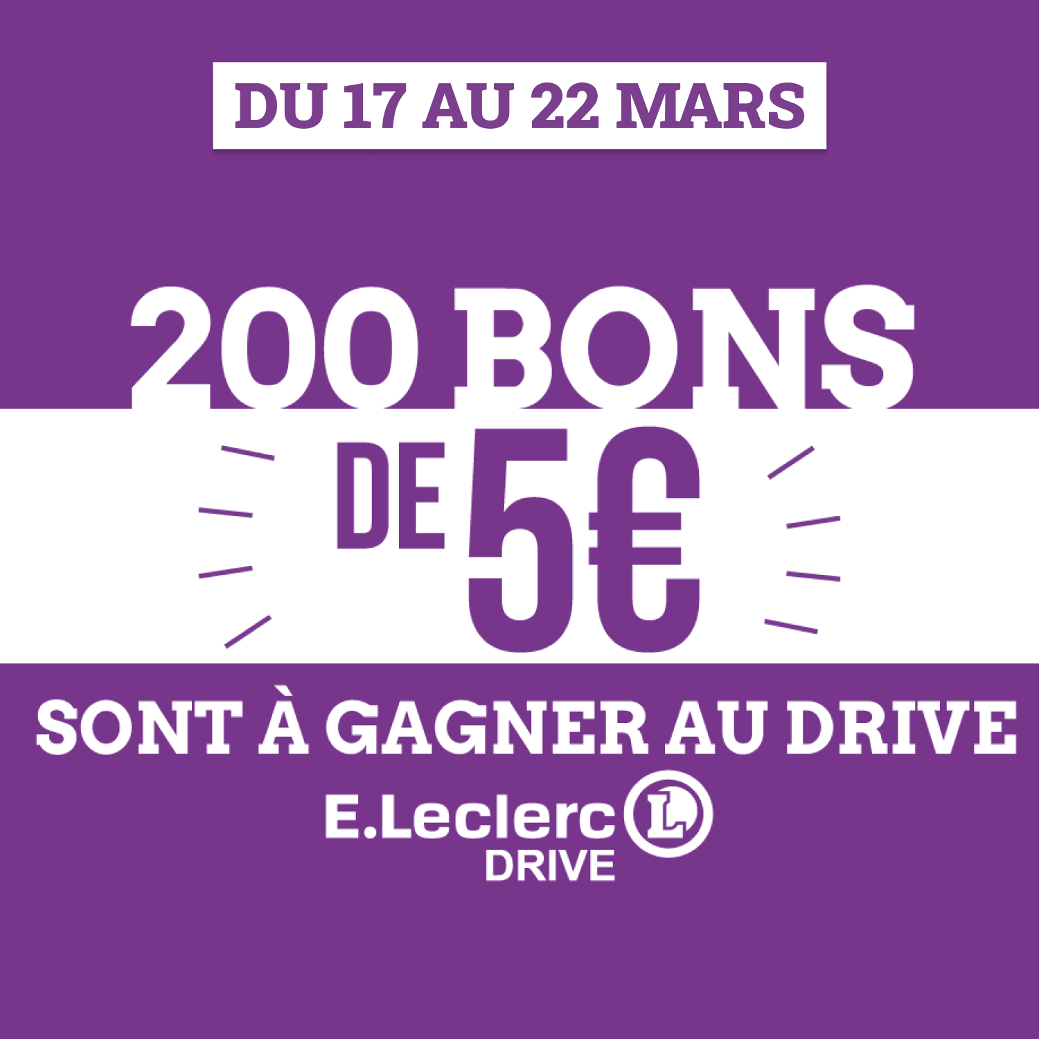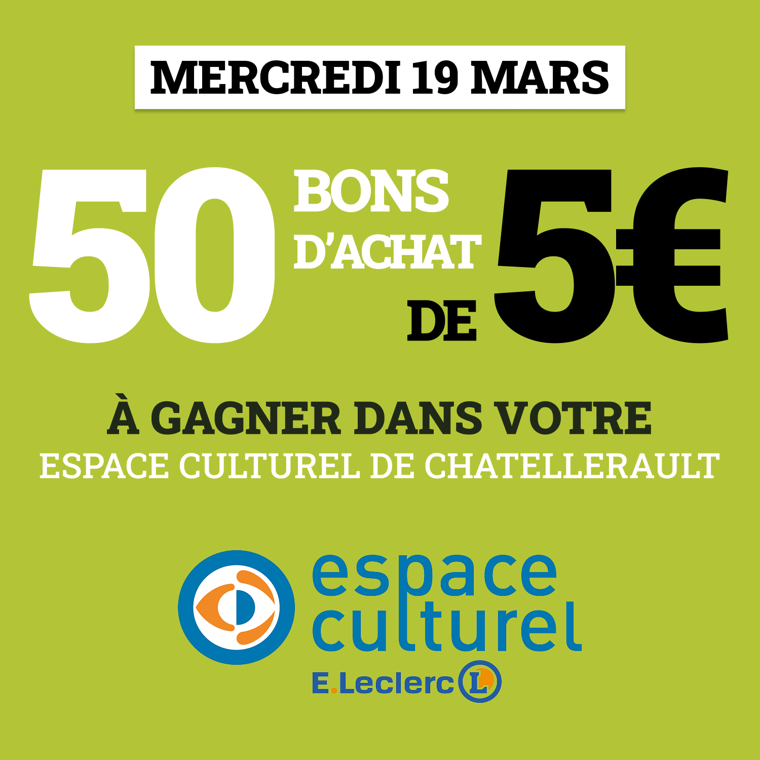 * Bénéficiez d’un bon d’achat papier attribué aléatoirement lors des passages en caisse lors de la journée du mercredi 19/3/2025. Bon valable dans votre Espace Culturel dès le lendemain et jusqu’au 12/04/2025. Cette opération ne concerne pas le Manège à Bijoux, La Parapharmacie, l’Agence de Voyages, le Drive, la Station service, la Cave Vins sur Vins et ne permet pas l’achat de cartes et «box» cadeaux.
