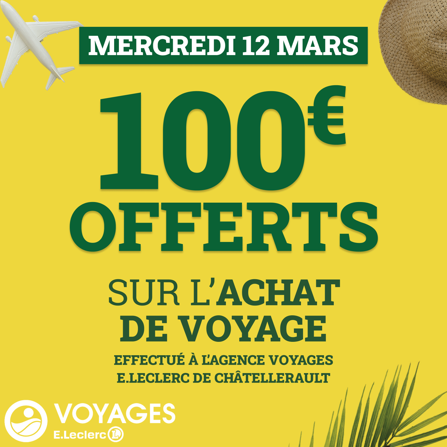 Sur présentation de ce coupon, Bénéficiez de 100€ en carte cadeau E.Leclerc pour l’achat d’un voyage de 1500€ minimum.