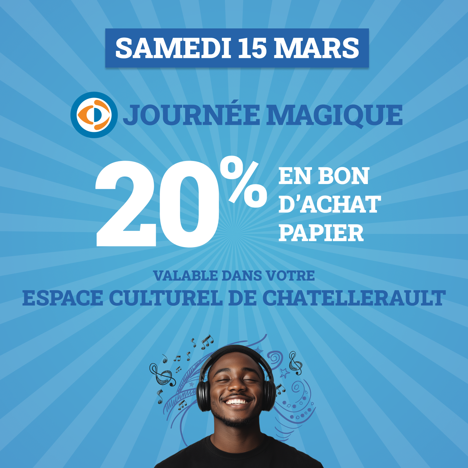 Bénéficiez d’un bon d’achat papier de 20% du montant à régler de votre ticket de caisse, valable uniquement dans votre Espace Culturel de Châtellerault dès le lendemain et jusqu’au 31/03/2025. Le Bon d’achat ne permet pas l’achat de cartes cadeaux. Offre non cumulable avec les Bons d’achats des Points fidélité et ne peut s’appliquer sur les Livres et la billetterie.