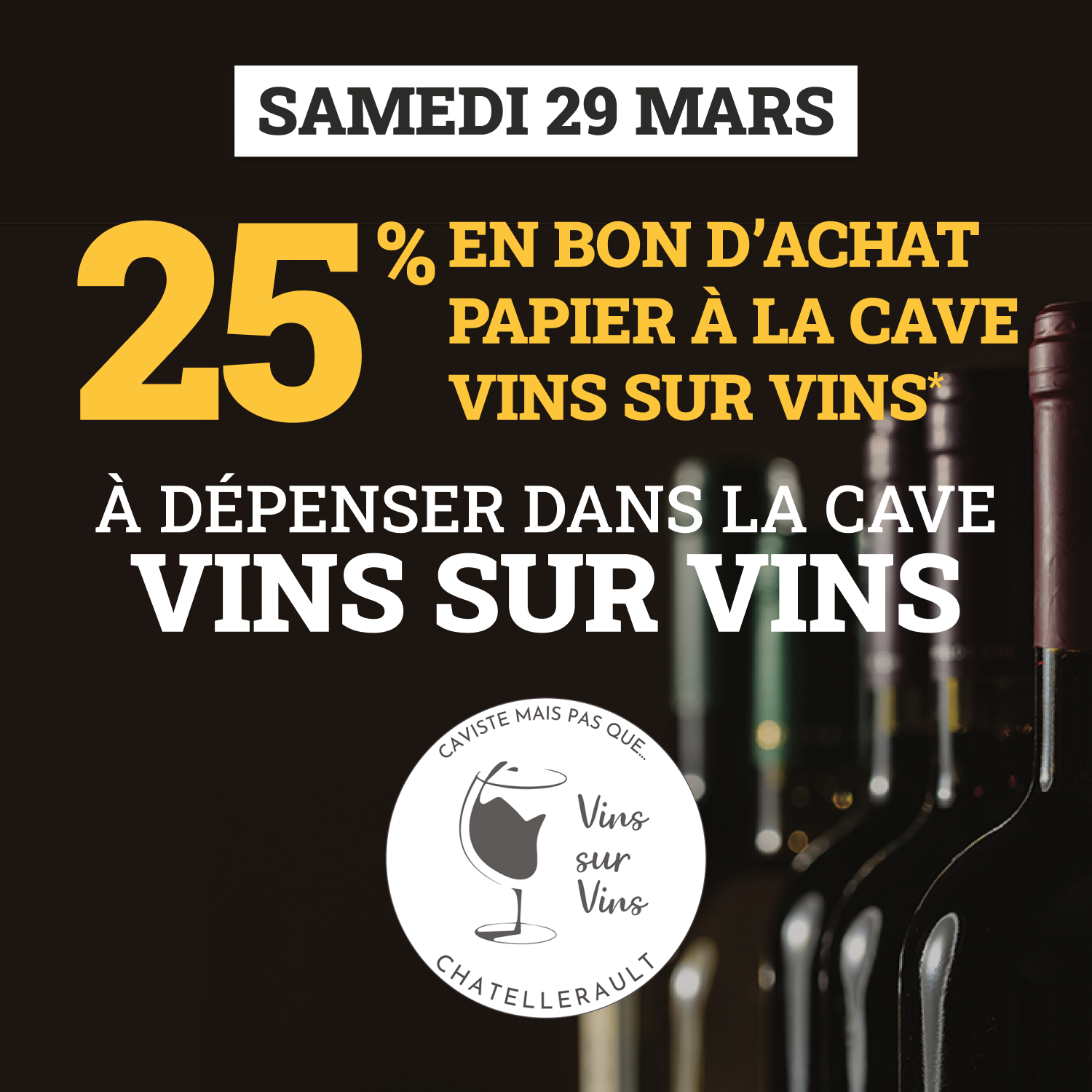 * Bénéficiez d’un bon d’achat papier en fonction de la valeur à régler de votre ticket de caisse, valable uniquement dans votre Cave Vins sur Vins, dès le lendemain et jusqu’au 30/04/2025. Ne permet pas l’achat de cartes et « Box » cadeaux. Hors vins d’exception. Offre non cumulable avec les promotions en cours et bons d’achats des points fidélités