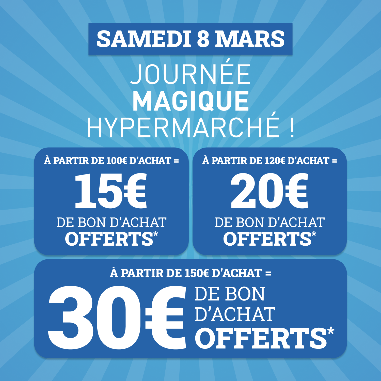 * Bénéfi ciez d’un seul bon d’achat papier en fonction de la valeur à régler de votre ticket de caisse, valable unique- ment dans votre Hypermarché, dès le lendemain et jusqu’au 31/03/2025. Cette opération ne concerne pas le Manège à Bijoux, La Parapharmacie, l’Agence de Voyages, L’Espace Culturel, le Drive, la Station service, la Cave Vins sur Vins, et ne permet pas l’achat de cartes et «box» cadeaux.