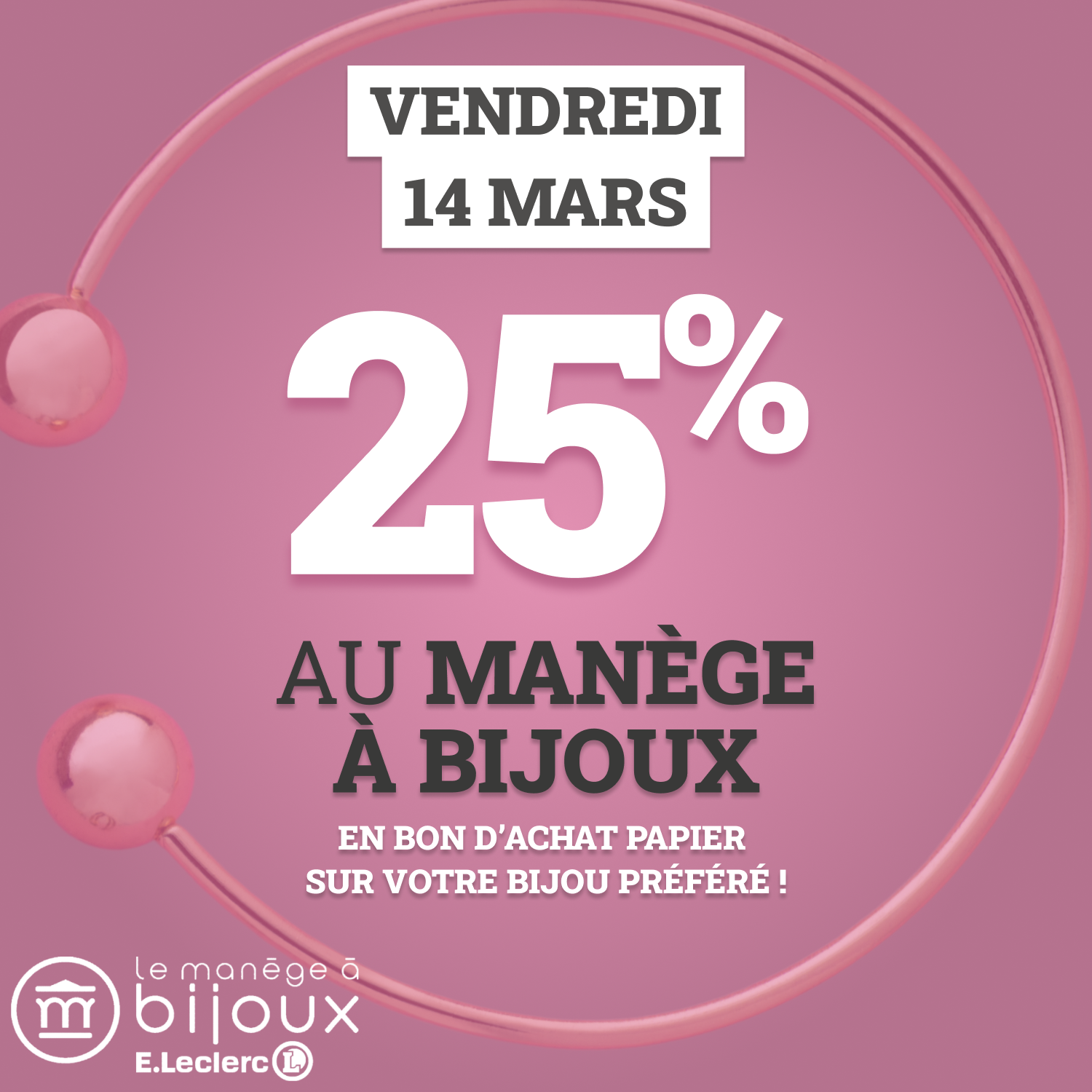 * Bénéficiez d’un bon d’achat papier de 25% du prix de votre Bijou préféré, bon d’achat valable dans votre Hypermarché, l’Espace Culturel, La Parapharmacie, Le Manège à Bijoux, Cave Vins sur Vins jusqu’au 31/03/2025. Le Bon d’achat ne permet pas l’achat de cartes cadeaux. Offre non cumulable avec les Bons d’achats des Points fidélité.