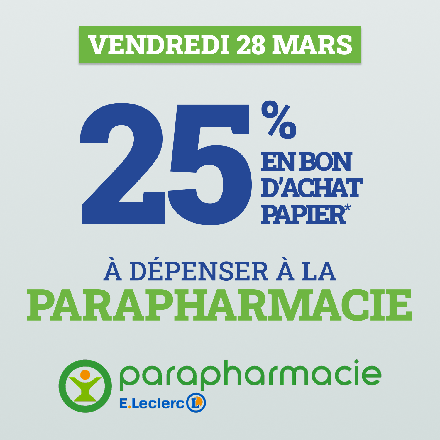 * Bénéficiez d’un bon d’achat papier en fonction de la valeur à régler de votre ticket de caisse, valable uniquement dans votre Parapharmacie dès le lendemain et jusqu’au 30/04/2025. Ne permet pas l’achat de cartes et « Box » cartes-cadeaux. Offre non cumulable avec les promotions en cours